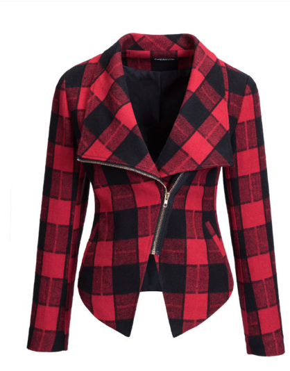 Lapel Zips Asymmetric Hem Plaid Jacket